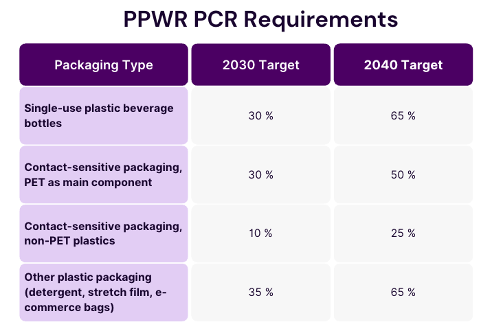 - Only post-consumer recyclate (PCR) counts. Post-industrial recyclate (PIR) does not satisfy the PPWR targets, even though many suppliers currently market PIR as "recycled content."