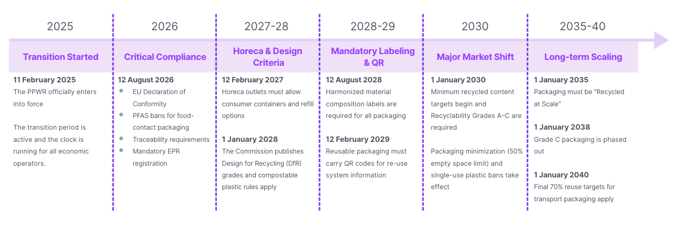 The PPWR entered into force on 11 February 2025, but the first hard compliance deadline is 12 August 2026. From that date, every packaging type placed on the EU market must be covered by a valid Declaration of Conformity. Later milestones for recycled content, labelling, and recyclability grades extend through 2040.